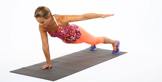 Ponovite izdržaj na laktovima, samo ovog puta podignite levu ruku(bočno ili pravo), oslanjajte se na desnu ruku. Nakon 30 sekundi vratite se u početni položaj i zamenite stranu.
